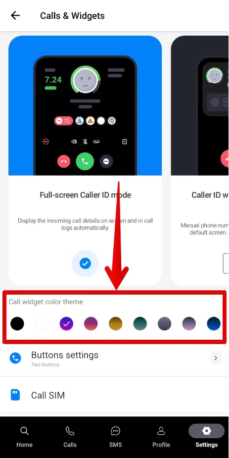 Позволяет изменить цветовую схему виджета или полноэкранного определителя.
